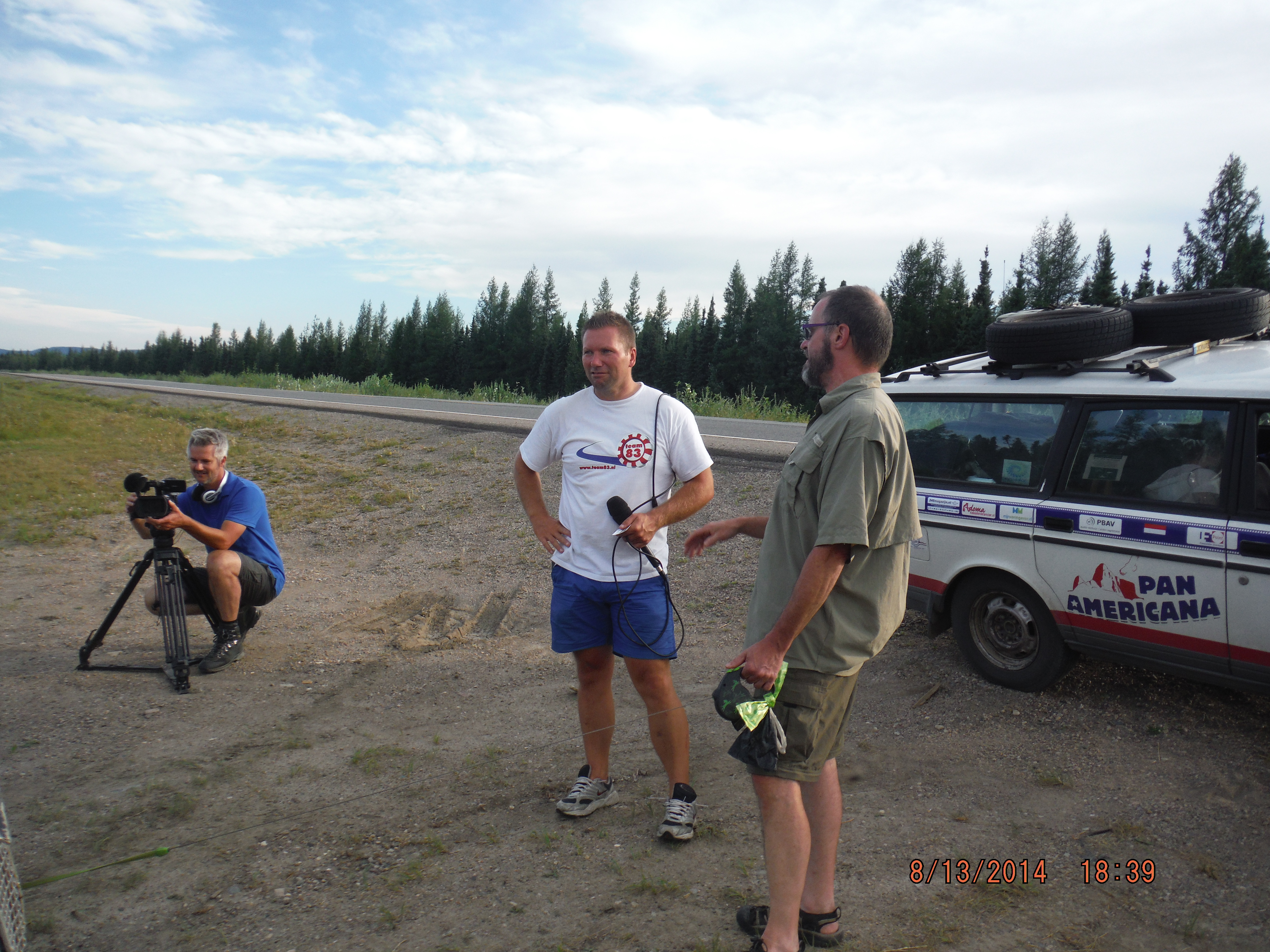 And that’s when we see these guys by the side of the road waving at us to stop! It’s one of the team of Volvos. It’s their film crew. Are they in trouble?