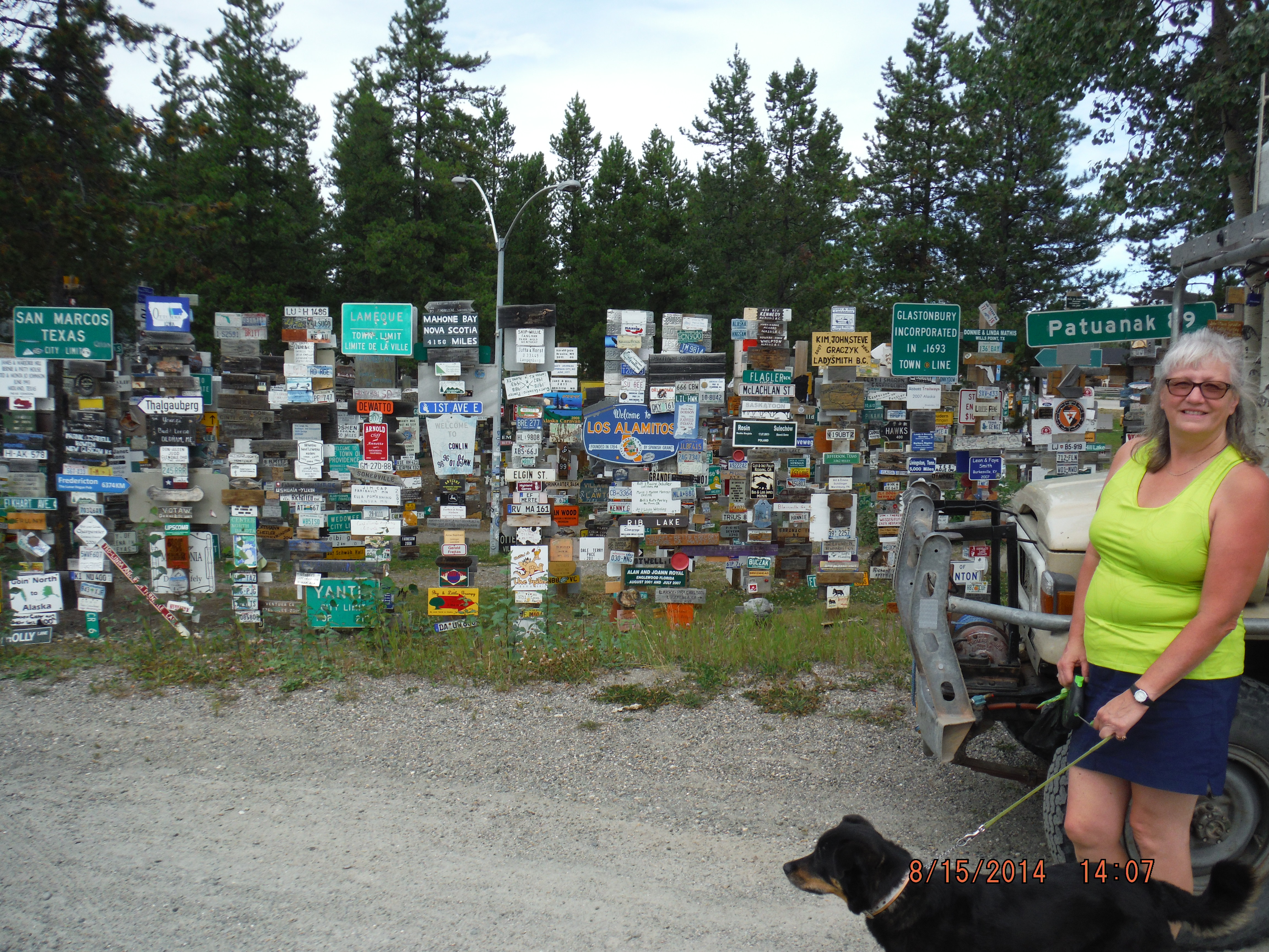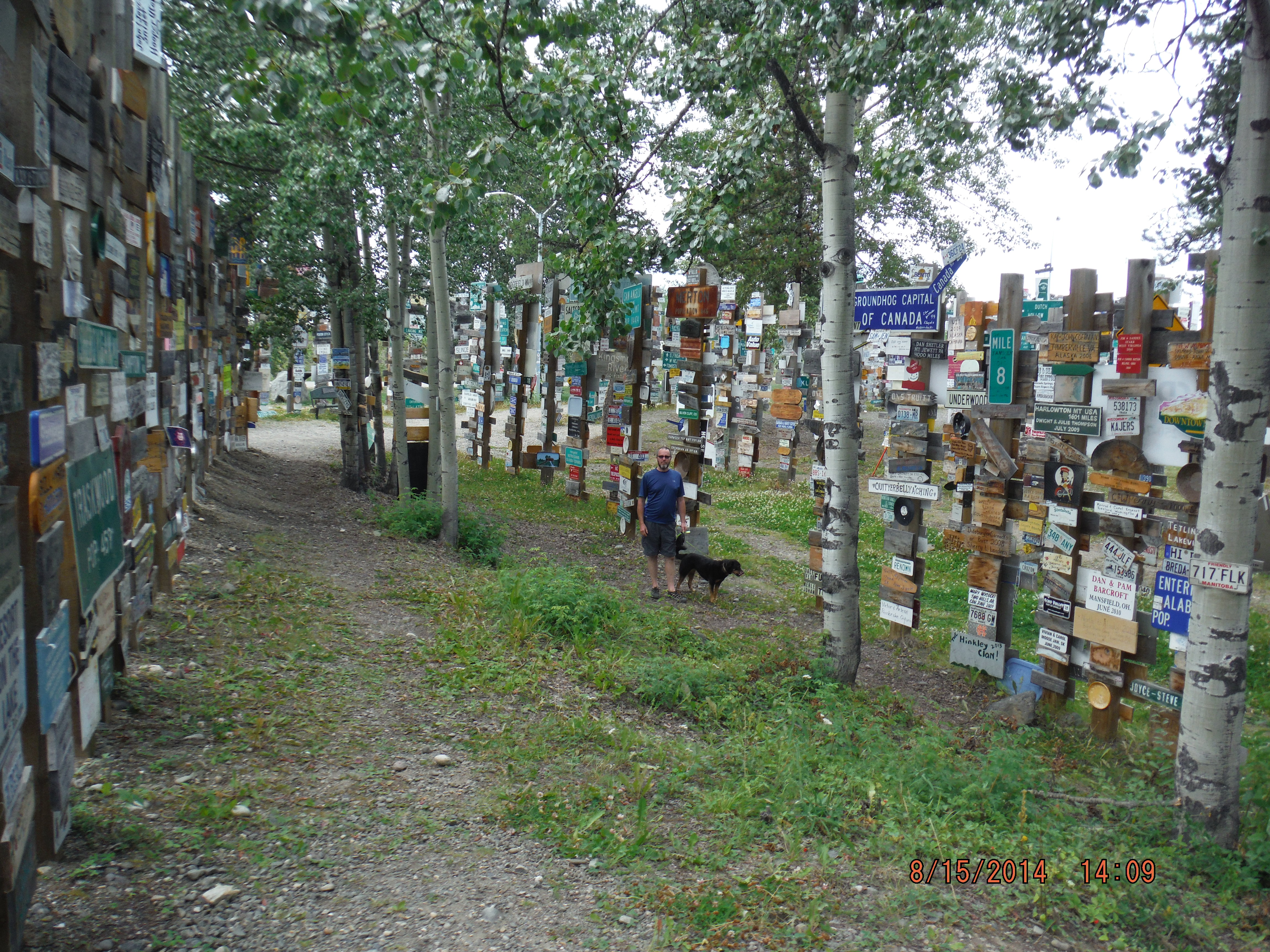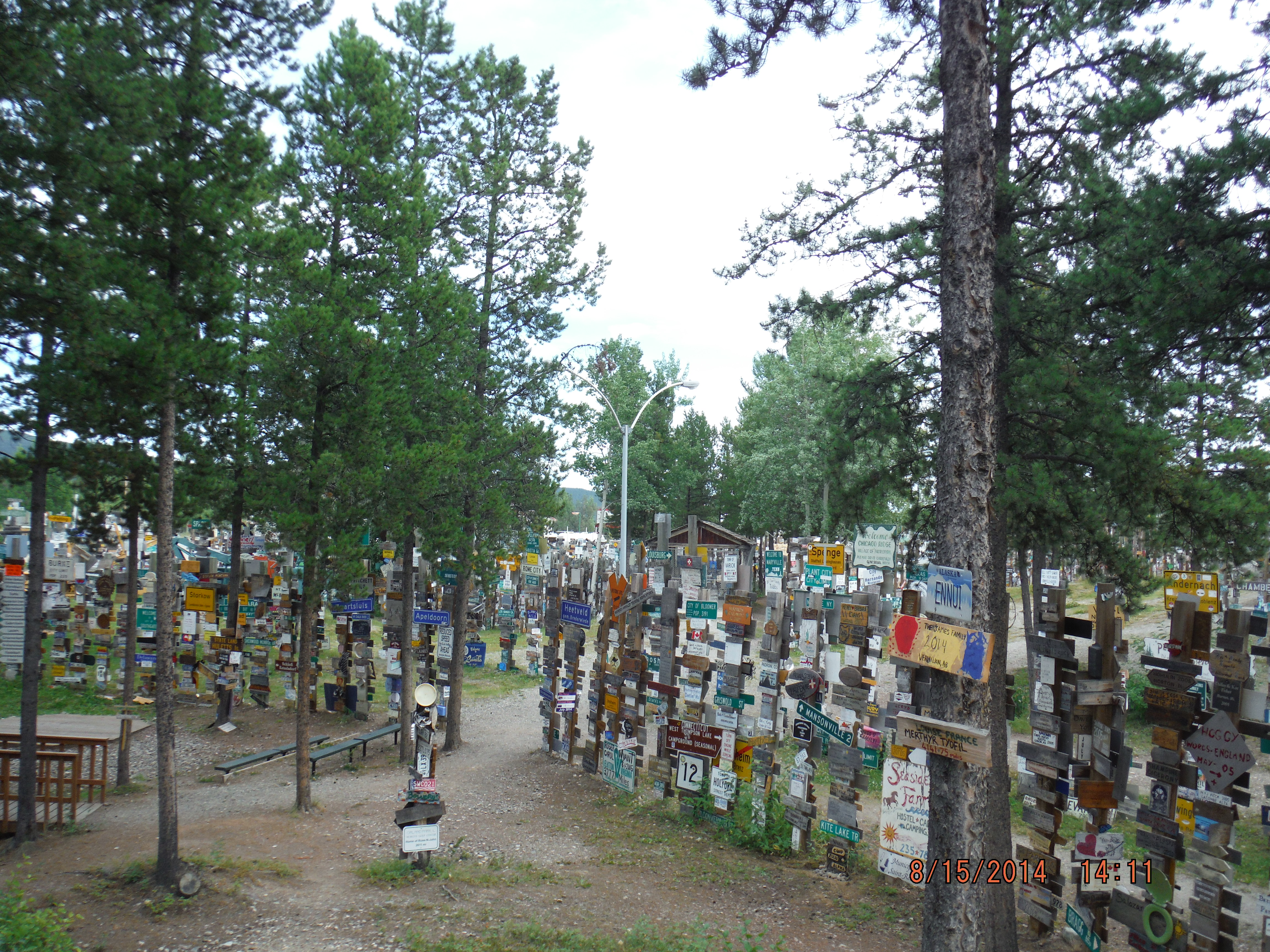 Then it’s on to Watson lake and the “world famous” sign post forest. Not sure how this started out but this is a place where travellers from litteraaly everywhere in the world will stop and, if not actually putting up a sign of their own, at the very least will spend some time admiring the mosaic! Over 78,000 signs at last count in 2013 (they’re being counted once a year, every year). Funny and impressive.